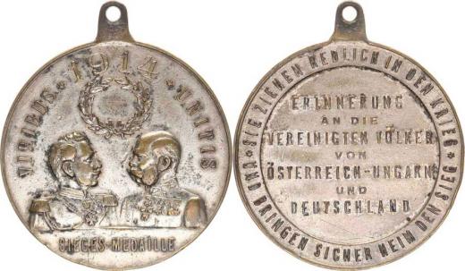 F.J.I. a Wilhelm II., VIRIBUS 1914 UNITIS - SIEGES MEDAILE, pod o tevřeným vavřín. věncem busty císařů v uniformách proti sobě, opi s / 7-mi řádkový nápis, opis stříbřený bronz 36 mm původní ouško