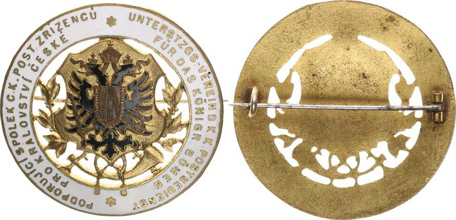 Čechy - Podporující spolek c.k. post. zřízenců pro království Čes ké, zlatý česko - německý 2-řádk. opis v bílém smaltu, uprosřed p rořezávaný zlacený poštovní znak zlacený masívní bronz 43,3 mm zapín. spona "sbírkový"