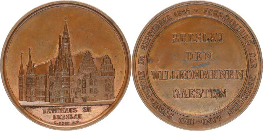 Slezsko - Vratislav (Breslau) - Rathaus, budova / Německý zemský lesnický sněm r. 1845, německý nápis, opis sign.: LOOS Cu 44 mm Fus. 4634 "R"