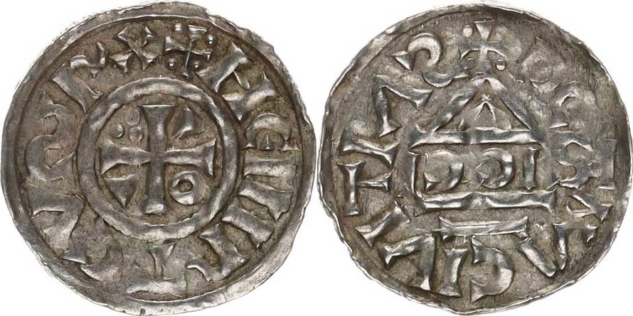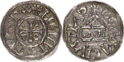 Denár (z let 1002-1009), Kříž, v úhlech klín-prstenec-klín-3 tečk y / Pod kaplici převráceně ICCIS Hahn 27 h 1 (h 2) 1,556 g