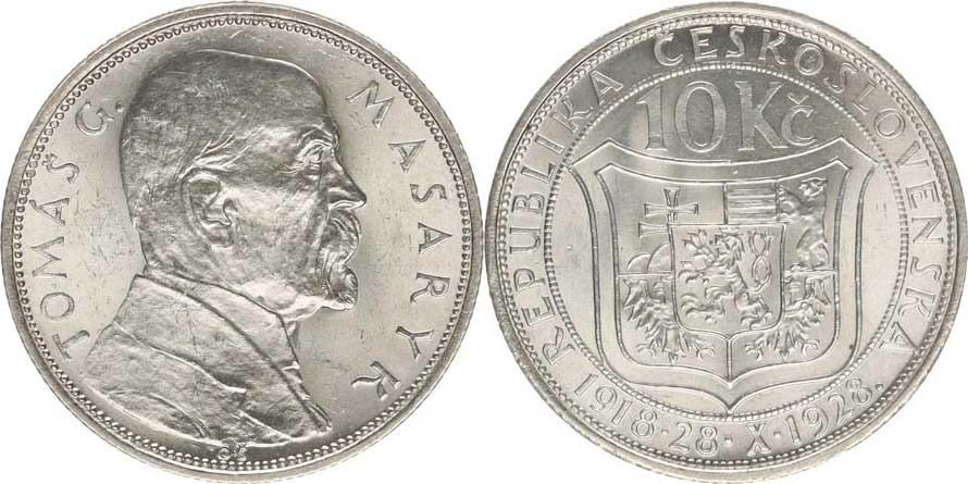 10 Kč 1928 TGM_tém.