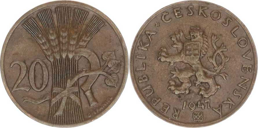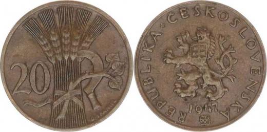 20 hal. 1947 - var.: po stranách hlavy lva paprsky "RR" 1,904 g
