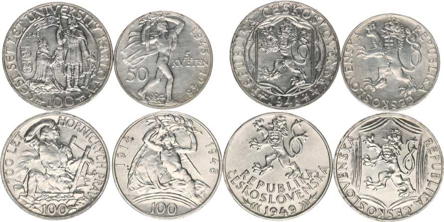 100 Kčs 1948 - 30. výr. republiky, +Karlova univerzita; +1949 - H ornické právo; +50 Kčs 1948 - 5. květen 4 ks
