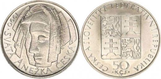 50 Kčs 1990 - sv. Anežka, se signaturou autora