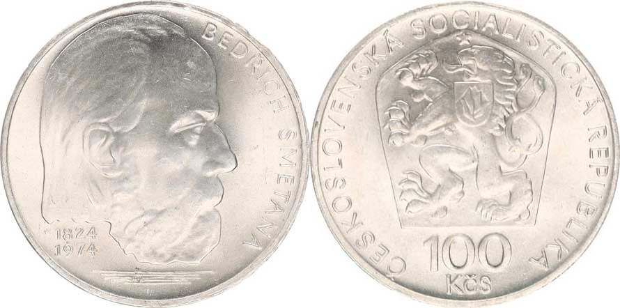 100 Kčs 1974 - Smetana, -nápis na hr. čitelný z Rv. (od znaku)