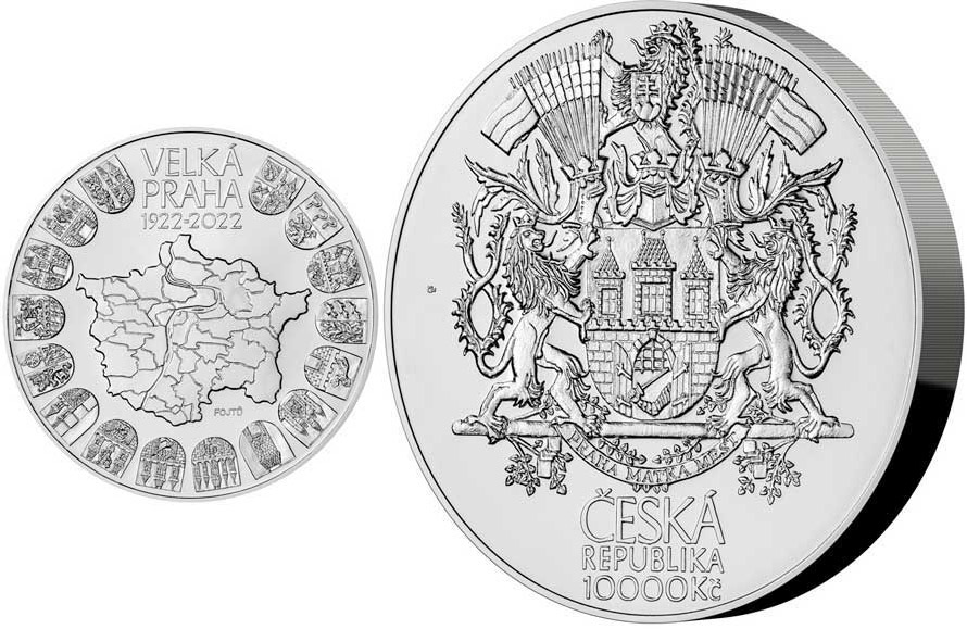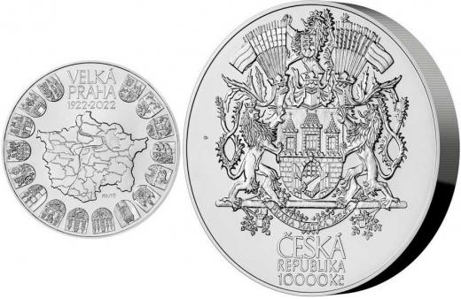 10 000 Kč 2022 - 100 let od založení Velké Prahy (1 kg Ag) kapsle, dřevěná krabička +certifikát (pouze 2 300 ks)