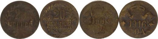 20 Heller 1916 T - mosaz KM 15 - oba typy: velká a malá ko runa 2 ks