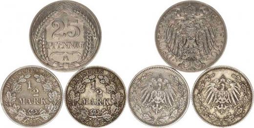 1/2 Mark 1913 D, 1919 J; +25 Pf. 1910 A 3 ks