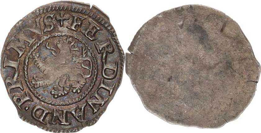 Bílý peníz b.l., K.Hora opis: FERDINAND. PRIMVS vysoký křížek "R" 0,387 g