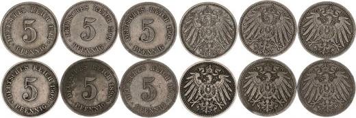 5 Pfennig 1897 D, 1898 F, 1902 F, 1909 A, D, 1913 G 6 ks