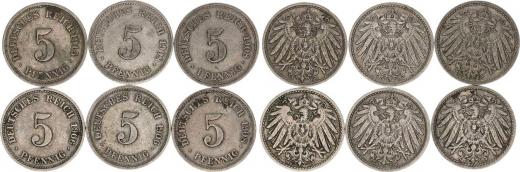 5 Pfennig 1906 D, G, 1908 D, F, J, 1915 F 6 ks