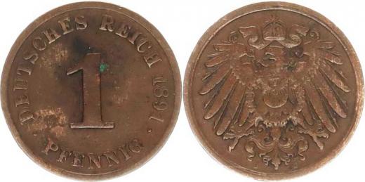 1 Pfennig 1891 J "R"_patina, tém.