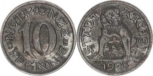 Aachen - 10 Pfennig 1920, sedící pes Fe 20,9 mm Funck 1.1; Men18 99.1