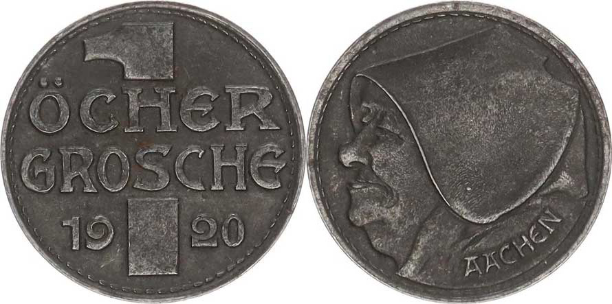 Aachen - 1 Öchergrosche 1920, hlava zleva Fe 21 mm Funck 1.5; Men18 99.15