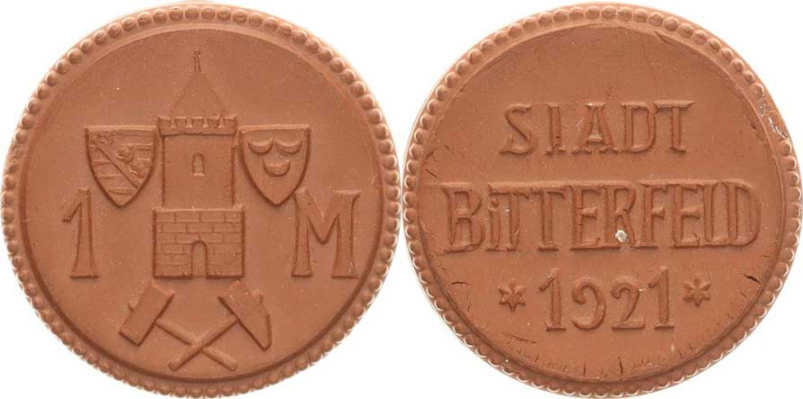 Bitterfeld - 1 M 1921 míšeňský hnědý porcelán 29,7 mm 4,176 g Menzel 2005 / 2923.1
