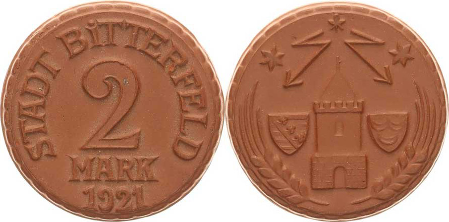 Bitterfeld - 2 M 1921 míšeňský hnědý porcelán 31 mm 5,7 g Menzel 2005 / 2923.3