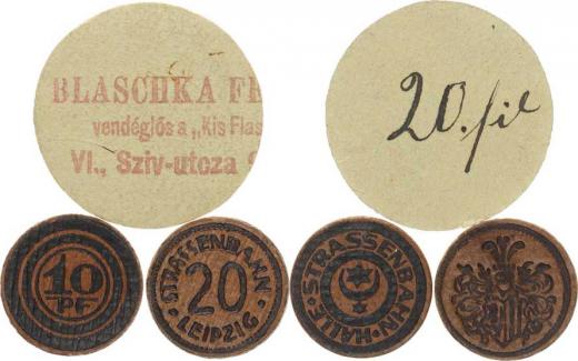 Leipzig - 20 Strassenbahn b.l.; +10 Pfennig Strassenbahn b.l. (cc a 1920) papír/karton 24 mm 2 ks +podložní štítek