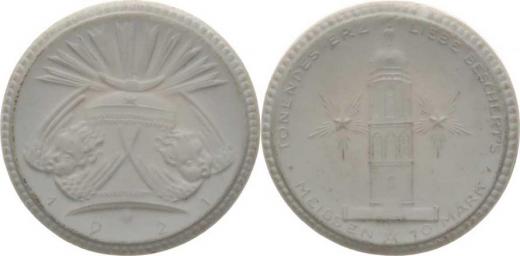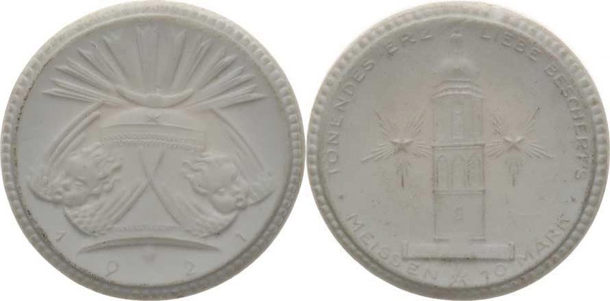 Míšeň - 10 Mark 1921, po stranách kostelní věže hvězdy / Boží svě tlo nad zvonem, po stranách hlavy letících andělů bílý míšeň ský porcelán 40 mm