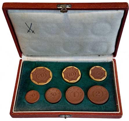 Míšeň - Kompletní sada 7 ks nouzovek roč. 1921 - v původní společ né etui ! (20, 50 Pfennig, 1, 2, 5, 10, 20 Mark) - hnědý porcelá n