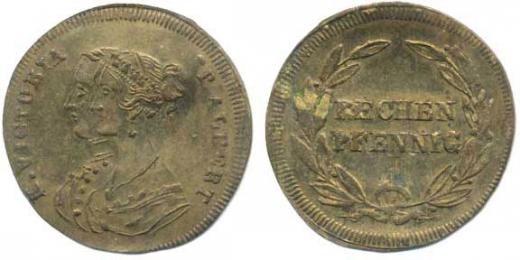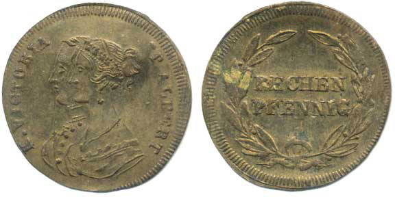 Norimberk - Početní žeton (pol. 19. stol.), Dvojportrét královny Viktorie a prince Alberta (svatba 10.II. 1840) / Mezi dvěma sváza nými vavřínovými větvičkami nápis: RECHEN / PFENNIG mosaz 23 mm