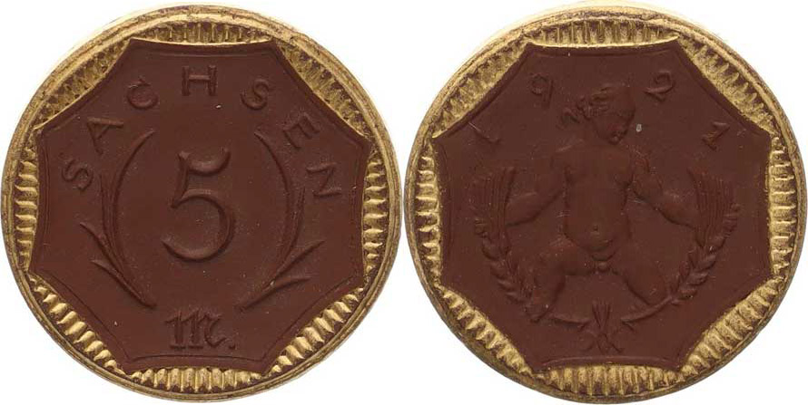 Sasko - 5 Mark 1921, Putti drží v každé ruce obilní klas hnědý míšeňský porcelán se zlatým okrajem 24,5 mm