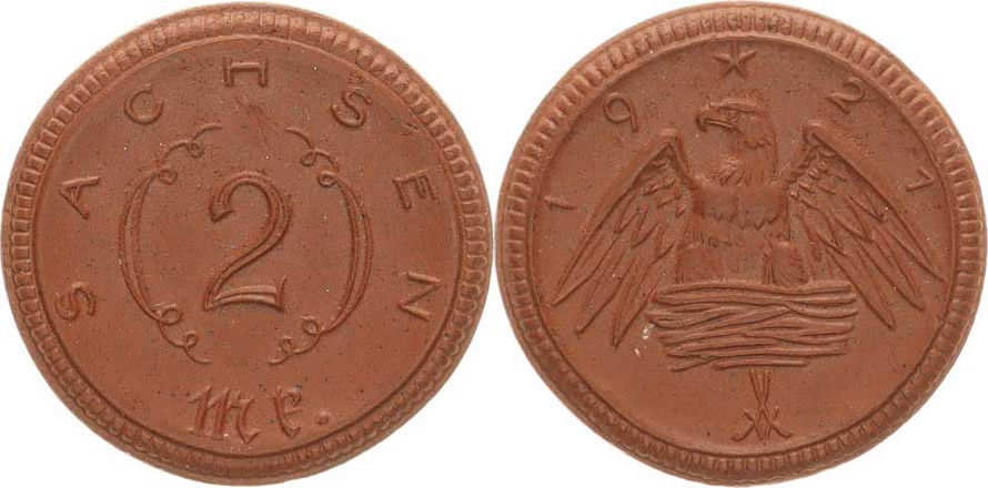 Sasko - 2 Mark 1921 míšeňský hnědý porcelán 27,5 mm 4,313 g Menzel 2018 / 27868