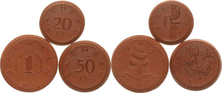 Sasko - 1 Mark 1921- plachetnice; +50 Pf. 1921 - hrozen a rýč; 20 Pf. 1921 - srp a klasy míšeňský hnědý porcelán 25, 20, 18 mm Menzel 18/27868.14; 27868.9; 27868.4 3 ks