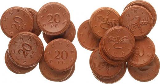 Sasko - 20 Pfennige 1921, míšeňský hnědý porcelán 19,3 mm (9 k s) +1 x 20,3 mm Menzel 2018 / 27868.4 10 ks