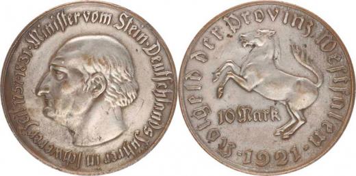 Westfahlen - 10 Mark 1921 Stein postříbřený bronz 38 mm ! 18,891 g "R"