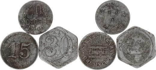 Wiesbaden - 10 Notgeld (b.l.) Fe 21 mm Hamburg - Hochbahn "30" Fe šestihran 23,7 mm Chemnitz - Strassenbahn "15" Fe 23,3 mm 3 ks
