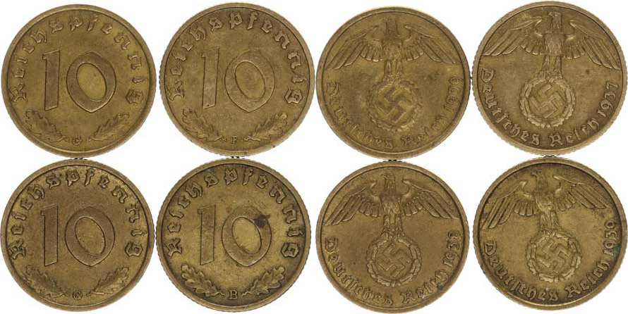 10 Rpf. 1937 F, 1938 G, 1939, B, G 4 ks