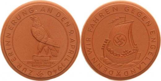 Upomínka na 9. 4. 1940, Sedící orel a opis / Vikingská plachetnic e se svastikou na plachtě, opis: DENN WIR FAHREN GEGEN ENGELLAND hnědý porcelán 50,5 mm "RR" Scheuch 1870