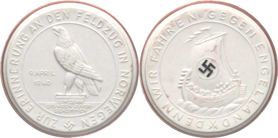 Na památku invaze do Norska 9.4. 1940, Sedící orel zleva, opis / Vikingská plachetnice s černou svastikou na plachtě, opis: DENN W IR FAHREN GEGEN ENGELLAND bílý míšeň. porcelán s hnědou hranou 49 mm katal. č. 1867w