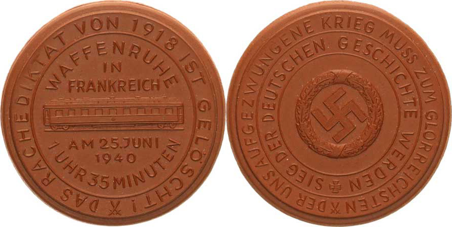 Kapitulace Francie 25. 6. 1940, Železniční vůz uprostřed, 6-ti řá dk. nápis, opis / Uprostřed svastika v dubovém věnci, ve dvou kru zích opisy hnědý míšeňský porcelán 50 mm