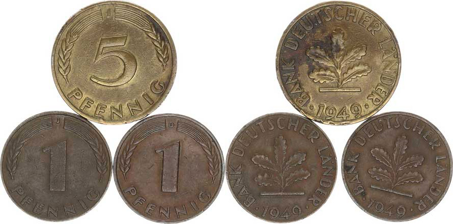 1 Pfennig 1949 D, G - Bank Deutscher Länder KM A101 5 Pfennig 1949 J - Bank Deutscher Länder KM 102 3 ks_tém.