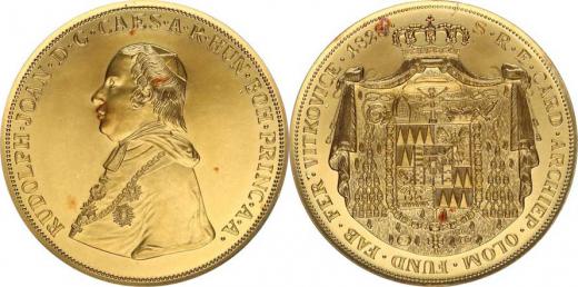 5 Dukát 1828 - Replika vydaná u příležitosti výročí založení VŽKG S.R.E.CARD.ARCHIEP.OLOM.FUND.FAB.FER.VITKOVICE.1828, erb / Poprsí arcibiskupa zleva Au 36 mm 17,556 g "RR"_červ. skvr.