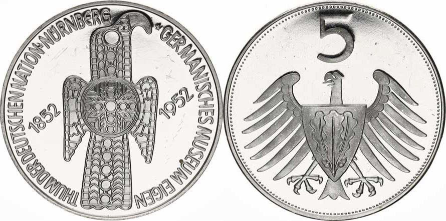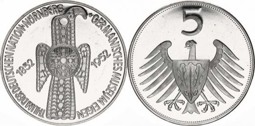 5 DM 1952 D - Museum Norimberg, medailová ražba - postř. bro nz 17,253 g_zkouška na hr.