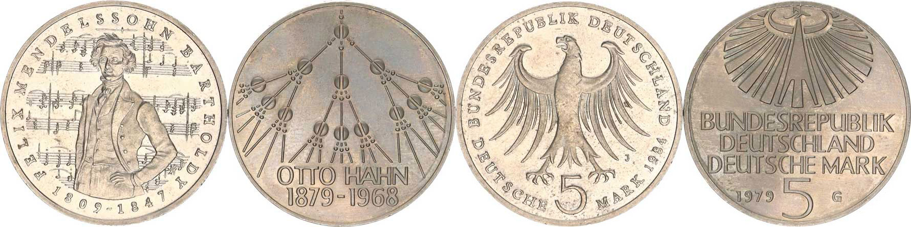 5 DM 1979 G - Otto Hahn KM 151 5 DM 1984 J - Felix Mendelssohn-Bartholdy KM 161 2 ks