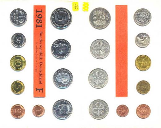 Ročníková sada mincí 1981 minc. F (1, 2, 5, 10, 50 Pf., 1, 5, 2 DM - Adenauer, Heuss, Schumacher) 10 ks zataveno v orig. foli i mincovny MS 30