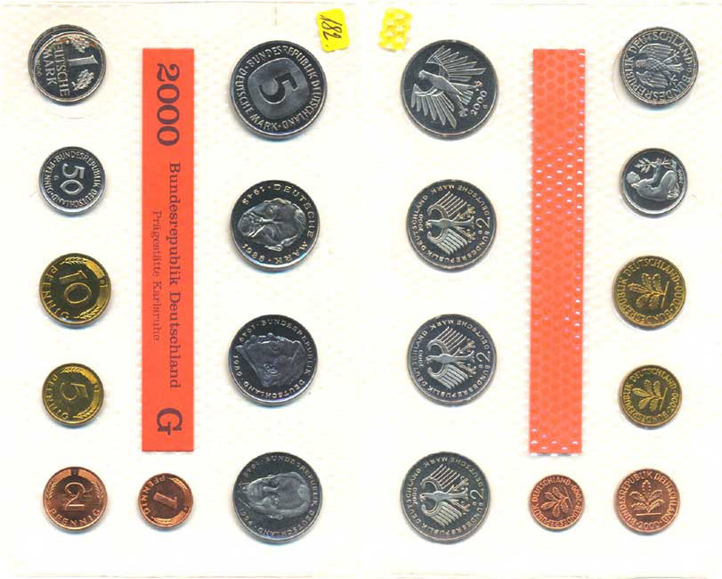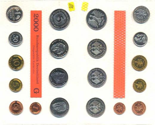 Ročníková sada mincí 2000 minc. G (1, 2, 5, 10, 50 Pf., 1, 5, 2 DM - Eberhart, Strauss, Brandt) 10 ks zataveno v orig. folii mincovny MS 117