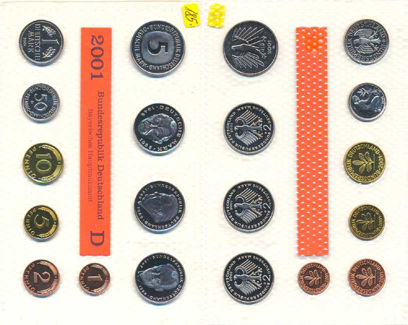 Ročníková sada mincí 2001 minc. D (1, 2, 5, 10, 50 Pf., 1, 5, 2 DM - Eberhart, Strauss, Brandt) 10 ks zataveno v orig. folii mincovny MS 120
