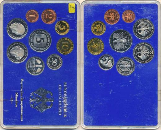 Ročníková sada mincí 1975 minc. D (1, 2, 5, 10, 50 Pf., 1, 5, 2 DM - Adenauer, Heuss) 9 ks v orig. plexi balení mincovny PS 36_otřelé plexi