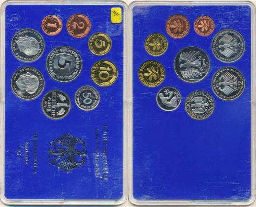 Ročníková sada mincí 1975 minc. G (1, 2, 5, 10, 50 Pf., 1, 5, 2 DM - Adenauer, Heuss) 9 ks v orig. plexi balení mincovny PS 38_mírně otřelé plexi