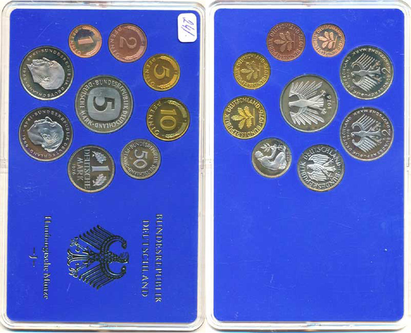 Ročníková sada mincí 1976 minc. D (1, 2, 5, 10, 50 Pf., 1, 5, 2 DM - Adenauer, Heuss) 9 ks v orig. plexi balení mincovny PS 40