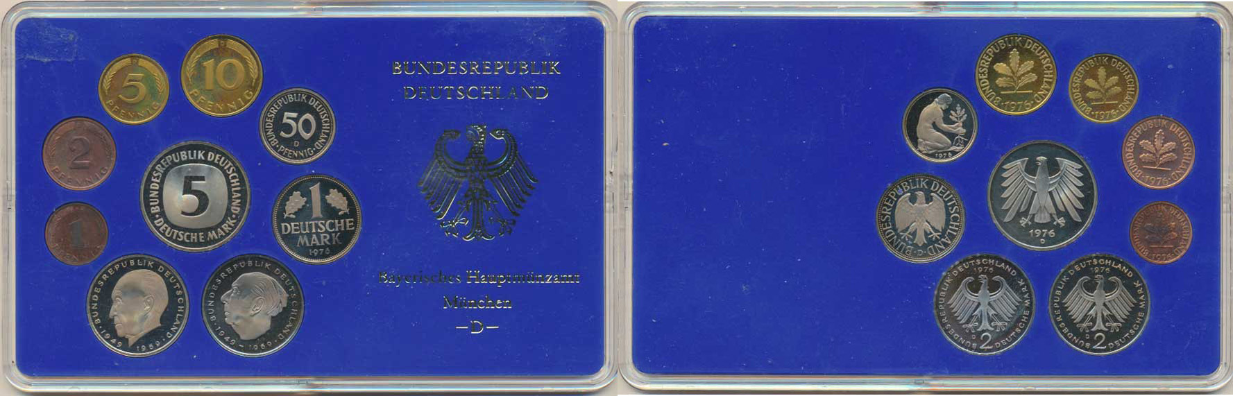 Ročníková sada mincí 1976 minc. D (1, 2, 5, 10, 50 Pf., 1, 5, 2 DM - Adenauer, Heuss) 9 ks v orig. plexi balení mincovny PS 40