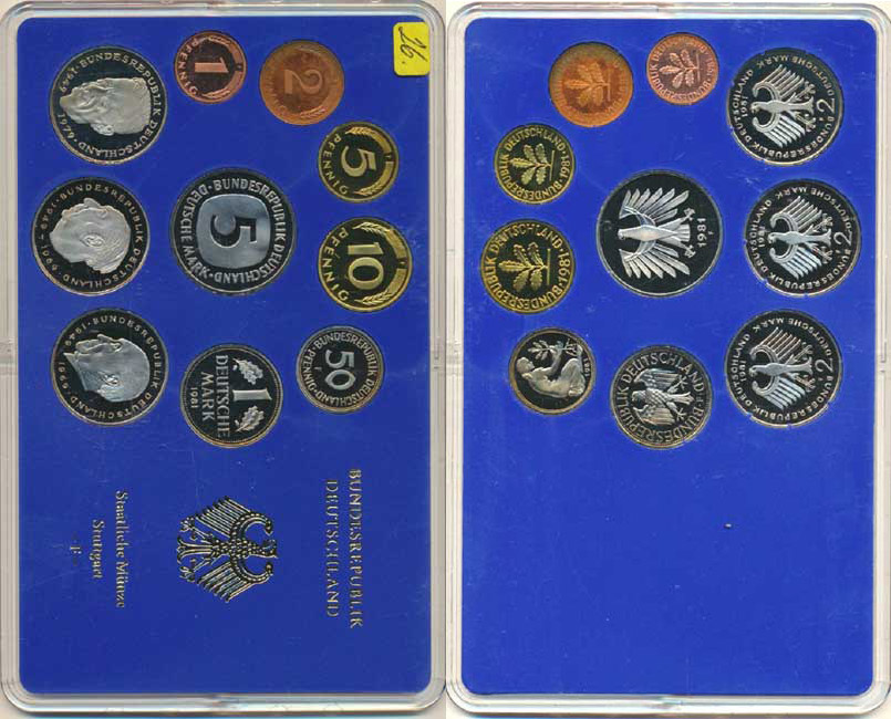 Ročníková sada mincí 1981 minc. F (1, 2, 5, 10, 50 Pf., 1, 5, 2 DM - Adenauer, Heuss, Schumacher) 10 ks v orig. plexi balení mincovny PS 61
