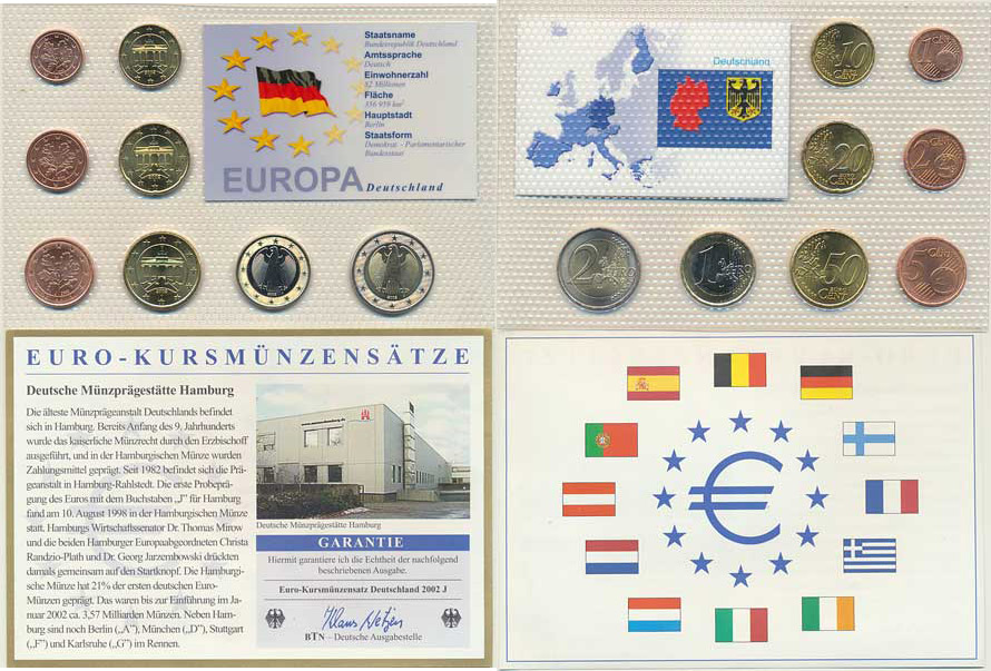 Ročníková sada mincí EURO 2002 minc. J (1, 2, 5, 10, 20, 50 Cent, 1, 2 Euro) 8 ks adjustace +certifikát BTN