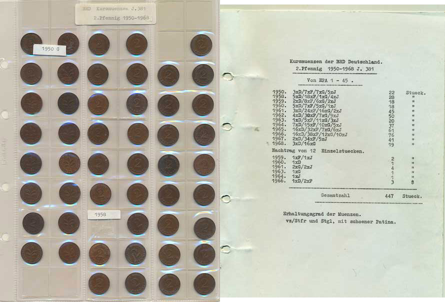 Konvolut 447 kusů mincí 2 Pfennig 1950-1968 , uložených v kroužko vém zásobníku zn. Philswiss o 9 listech _zásobník téměř nový