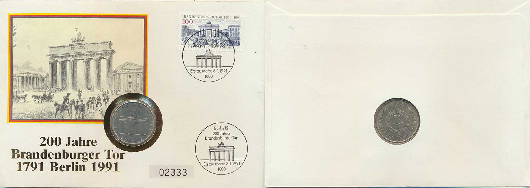 5 M 1971 A - Braniborská brána KM 29 adjustace jako m incovní dopis v barevné obálce se známkou 100 pf. +dvě příležitos tní razítka 8.1. 1991 pošta Berlin 12 obálka číslo 02333 mince 0/0