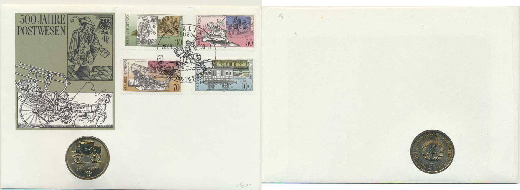 5 M 1990 A - 500. výročí pošty, "Mincovní dopis" grafická obálk a +4 známky s razítkem 28.8. 1990 Berlin